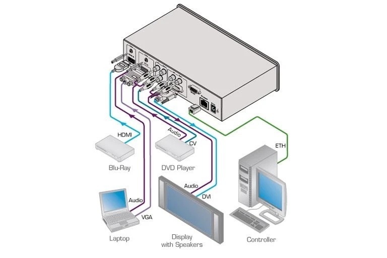 Масштабатор HDMI, VGA/YPbPr, композитного видео и аудио в HDMI с дополнительным выходом стереоаудио.