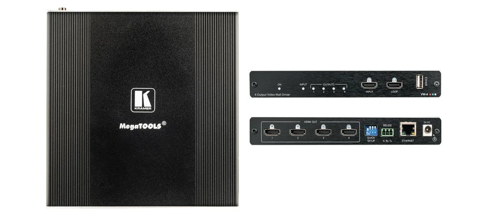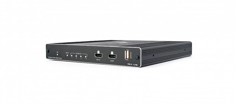 VW-4 — масштабатор, выполняющий функцию контроллера видеостены. При помощи одного прибора VW-4 можно легко и быстро построить видеостену любой размерности в пределах 4 дисплеев, например, 2х2, 4х1, 1х4, 2х1 или 3х1. Проходной вход HDMI позволяет использовать несколько масштабаторов для построения видеостен размером до 64 дисплеев. Основные настройки могут быть быстро выполнены при помощи DIP-переключателей. Имеется приложение для MS Windows, позволяющее осуществить полную настройку и мониторинг работы видеостены в удаленном режиме с использованием интерфейсов RS-232 и Ethernet.