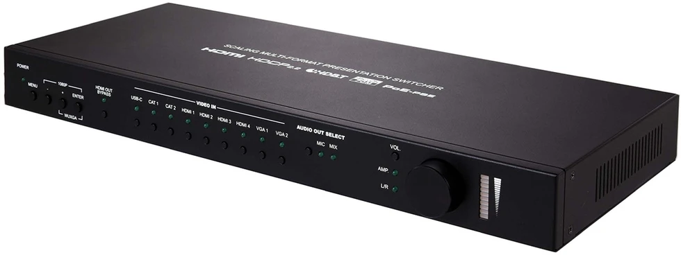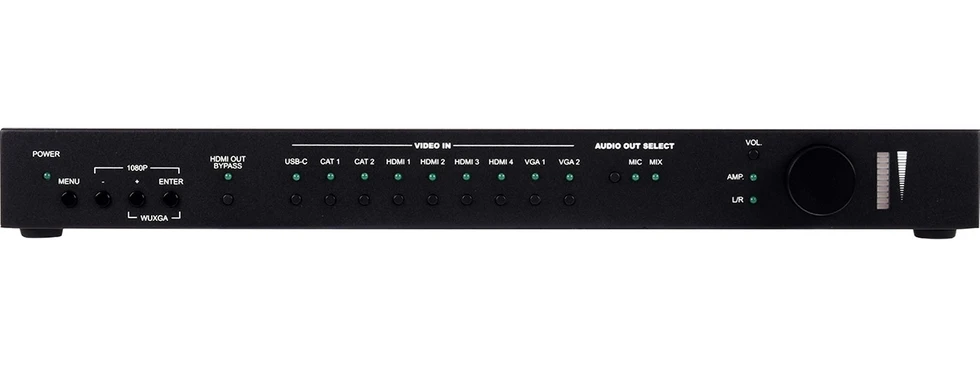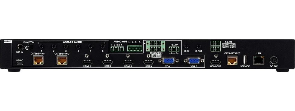 Масштабатор сигналов 4 х HDMI, 2 х HDBaseT, USB-C, 2 х VGA, микрофонного и 6 х стереоаудио в HDMI и HDBaseT (с PoH) с выходом балансного стерео и усилителем мощности 2 х 20 Вт.