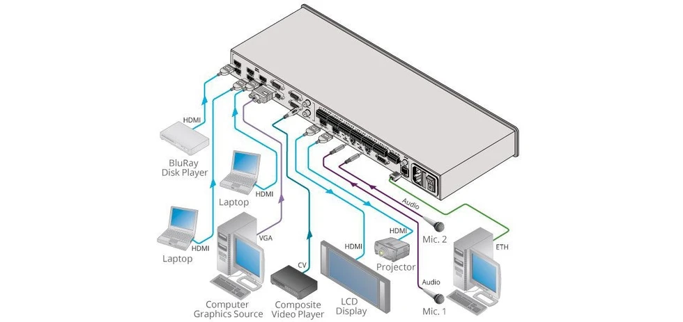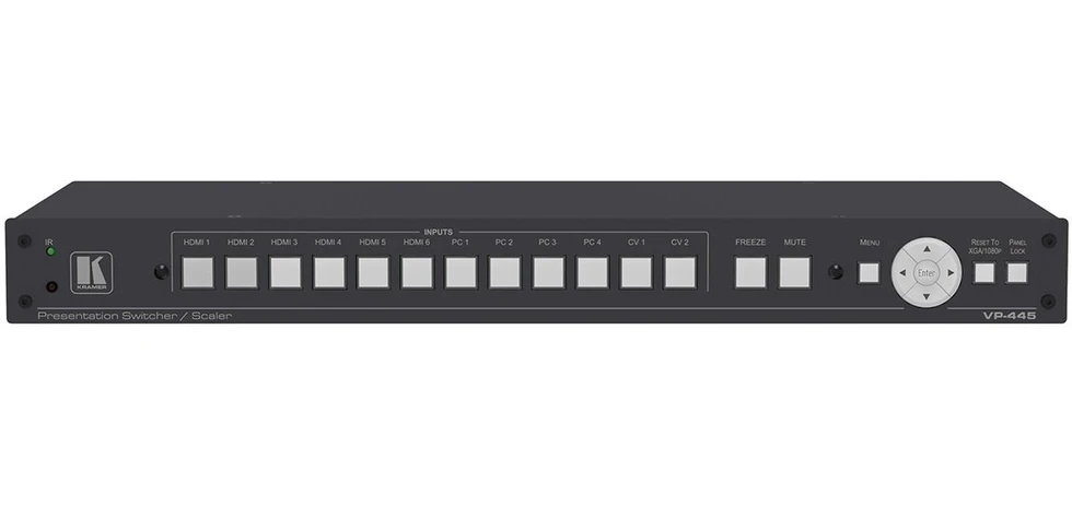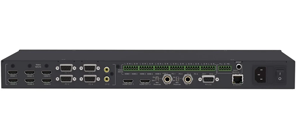 Масштабатор сигналов 6хHDMI c HDCP 1.4, 4xVGA, 2xCV (RCA), 12x небалансного стереоаудио (терм. блок) в сигналы 2xHDMI до 1080p, S/PDIF (RCA) и балансное стерео (терм. блок), управление по RS-232, ИК и IP, установка в стойку.