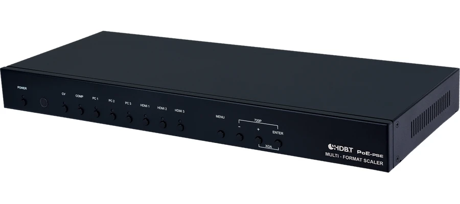 Масштабатор сигналов CV c аудио (3хRCA), YUV с аудио (5хRCA), 3хVGA c аудио (D-Sub-15 + miniJack 3,5 мм), 3хHDMI 1080p с аудио (3х miniJack 3,5 мм) в сигнал VGA (D-Sub-15), HDMI 1080p/60 (1920х1200) c HDCP и EDID, с выходом HDBaseT (до 1080p), с аудиовыходом (miniJack 3,5 мм) и S/PDIF (RCA), c управлением по ИК, RS-232, IP. Расстояние передачи – до 70 м.