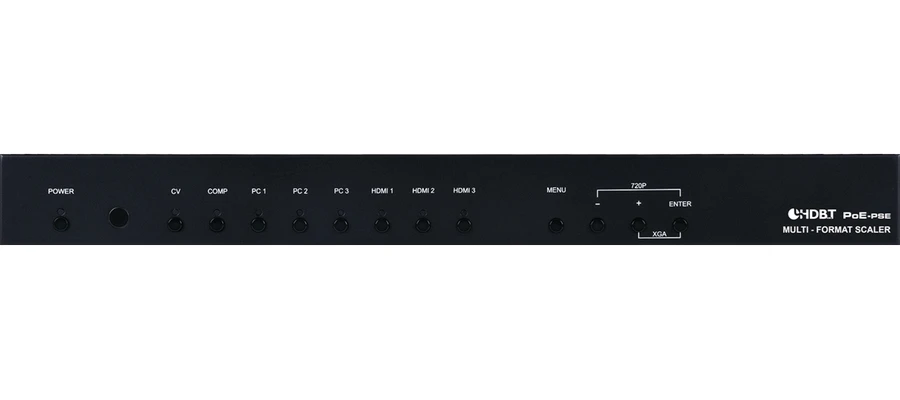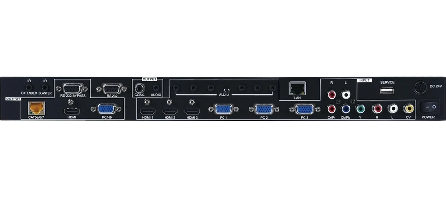 Масштабатор сигналов CV c аудио (3хRCA), YUV с аудио (5хRCA), 3хVGA c аудио (D-Sub-15 + miniJack 3,5 мм), 3хHDMI 1080p с аудио (3х miniJack 3,5 мм) в сигнал VGA (D-Sub-15), HDMI 1080p/60 (1920х1200) c HDCP и EDID, с выходом HDBaseT (до 1080p), с аудиовыходом (miniJack 3,5 мм) и S/PDIF (RCA), c управлением по ИК, RS-232, IP.
