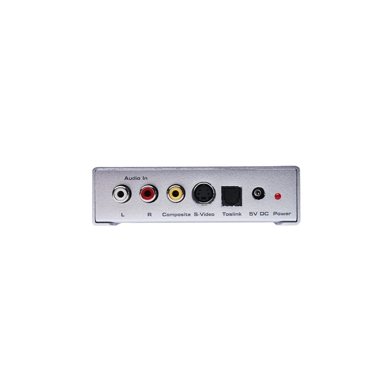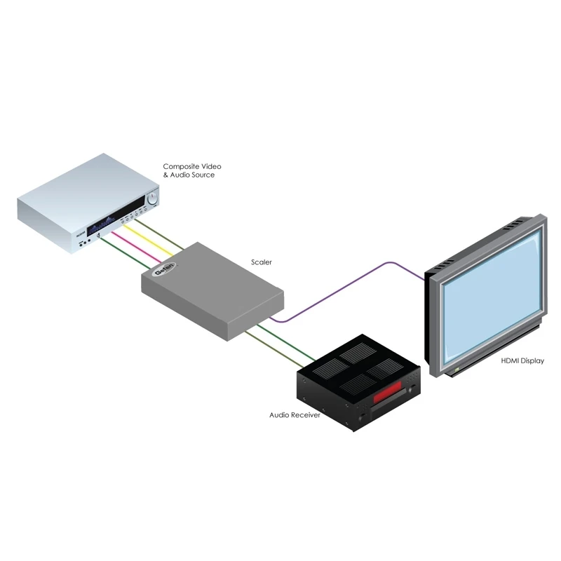 Масштабатор сигналов CV (RCA), S-Video (mini-DIN4), аналогового стерео (2xRCA) и цифрового аудио (TOSLINK) в сигналы HDMI 1080p (1920x1200), аналогового стерео (miniJack 3,5 мм) и цифрового аудио (TOSLINK), управление по ИК и RS-232.