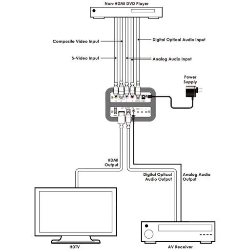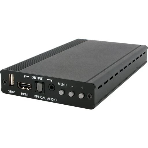 Масштабатор сигналов CV (RCA), S-Video (mini-DIN4), стереоаудио аналоговое (2хRCA) и цифровое S/PDIF (TOSLINK) в сигнал HDMI 1080p/60 (1920x1200) с HDCP, стереоаудио аналоговое (miniJack 3,5 мм) и цифровое S/PDIF (TOSLINK), коррекция изображения.
