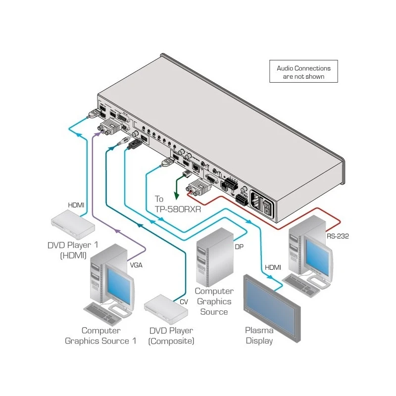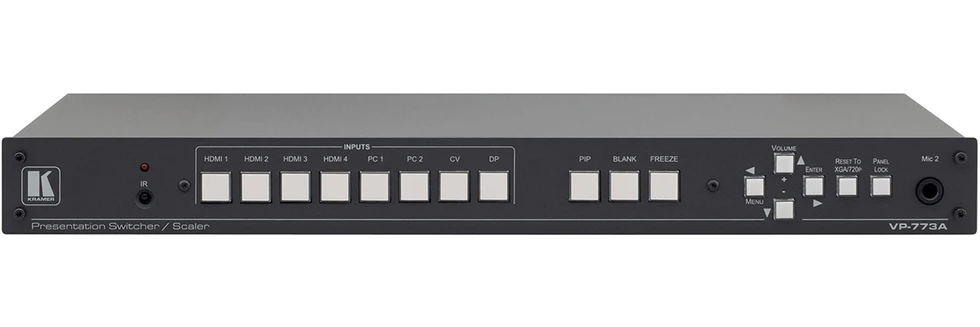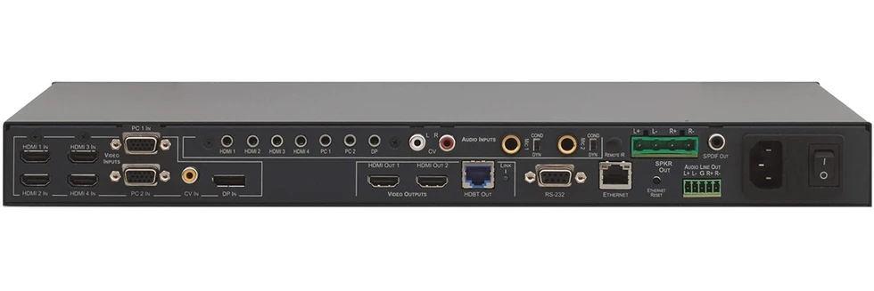 Масштабатор видео и графики / коммутатор без подрывов сигнала с аудиоусилителем. Входы: 4 HDMI, 2 VGA, CV, DisplayPort; выходы 2 HDMI, HDBaseT.