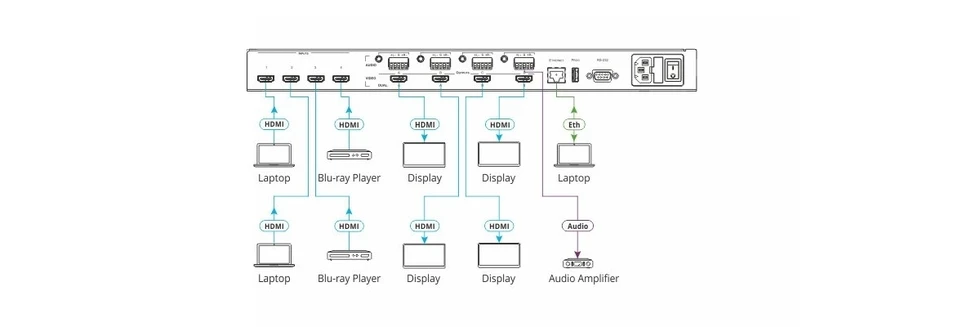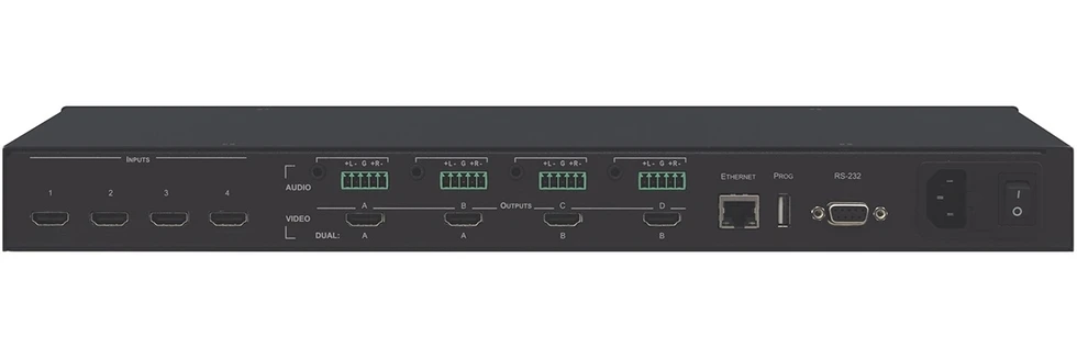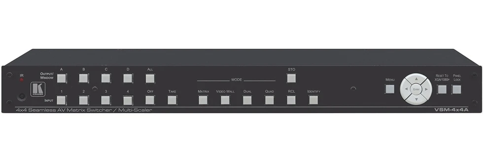 Матричный бесподрывный коммутатор 4x4 HDMI 1080p с HDCP и EDID, контроллер видеостены (2х2, 1х4), мультивьювер, масштабируемые выходы; балансные/небалансные аудиовыходы, эмбеддер, деэмбеддер. Управление по RS-232 и IP (web-интерфейс).