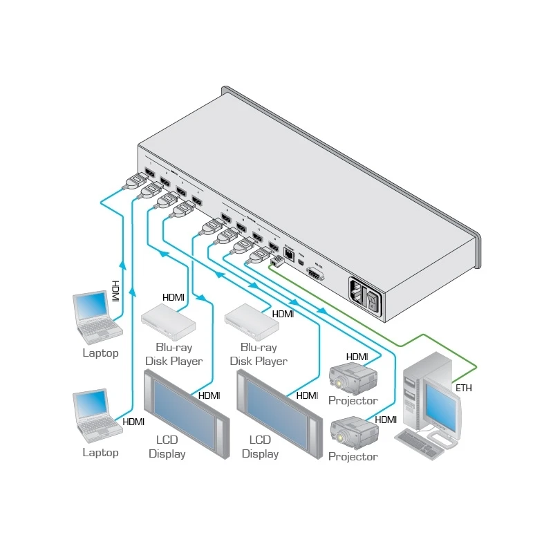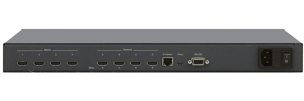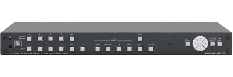 Матричный бесподрывный коммутатор 4x4 HDMI с масштабируемыми выходами.