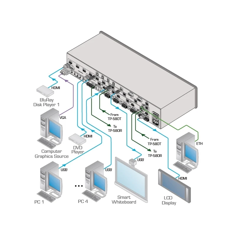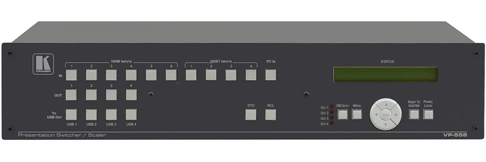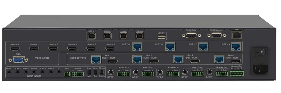 Матричный коммутатор 11x4 HDMI и VGA (6 входов HDMI, 4 входа HDBaseT, VGA), бесподрывный с масштабируемыми выходами; выходы на витую пару HDBaseT.