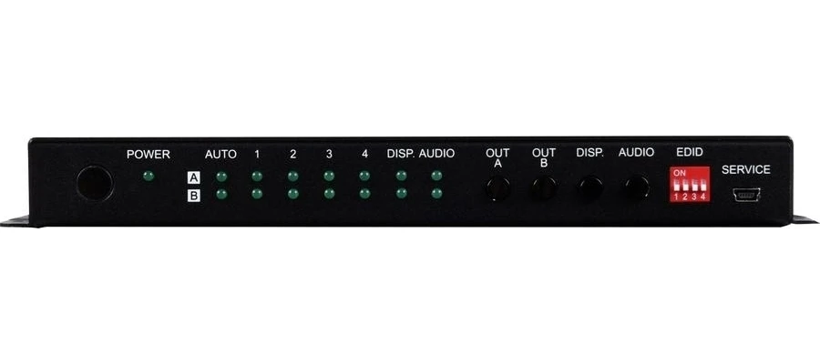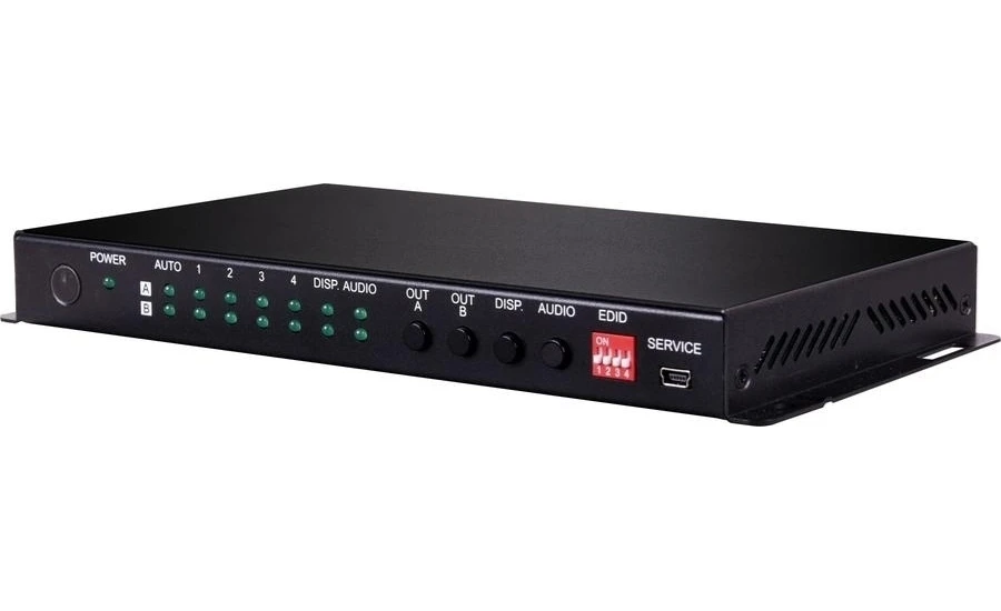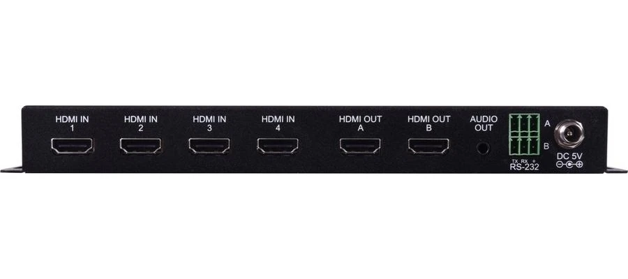 Матричный коммутатор 4х2 HDMI 2.0 UHD 4K (4096x2160/60 при 4:4:4) с HDCP 2.2, CEC и расширенным EDID, полоса пропускания 600 МГц, деэмбеддер стереоаудио, управление по ИК, RS-232 (коммутатором и устройством отображения).