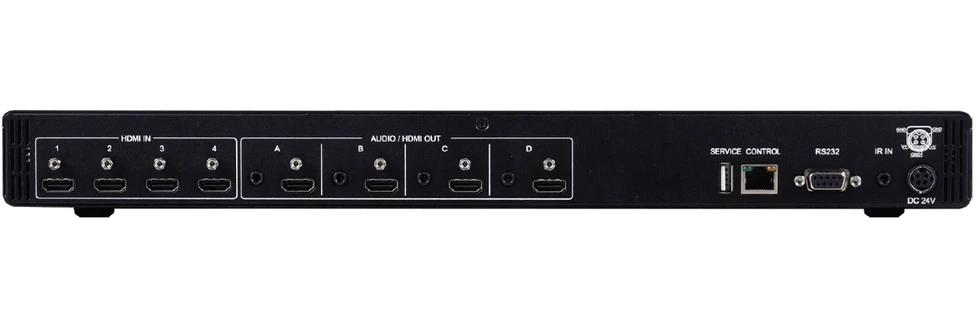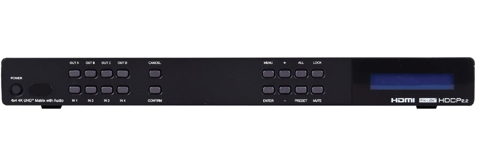 Матричный коммутатор 4х4 HDMI 2.0 4096x2160/60, 3D (4:4:4) с HDR, HDCP 1.4, 2.2 и расширенным EDID, 4 выхода стереоаудио (4х miniJack 3,5мм), 4 выхода USB для питания, полоса пропускания 600 МГц. Управление по ИК, RS-232 и IP (Telnet и web-интерфейс).