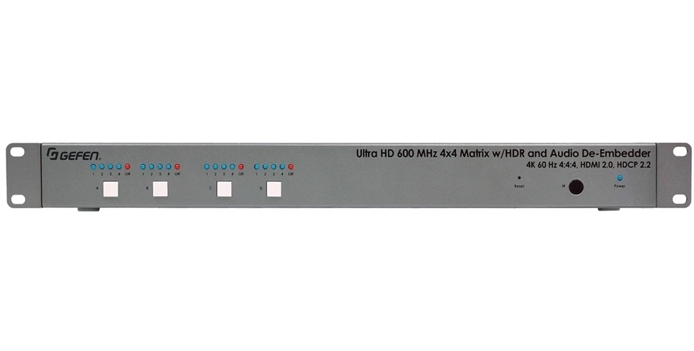 Матричный коммутатор 4х4 HDMI 2.0 4096x2160/60, 3D (YUV 4:4:4) с HDCP 1.4 и 2.2, EDID и HDR, полоса пропускания 600 МГц, входы 4хHDMI, выходы видео 4хHDMI с масштабированием (2 – с 1080p до 4K, 2 – с 4K до 1080p), деэмбеддеры цифрового аудио до 5.1 (4хTOSLINK и 4хRCA) и стереоаудио (4хminiJack 3,5 мм), управление по ИК, RS-232 и IP, ПО Gefen Syner-G.