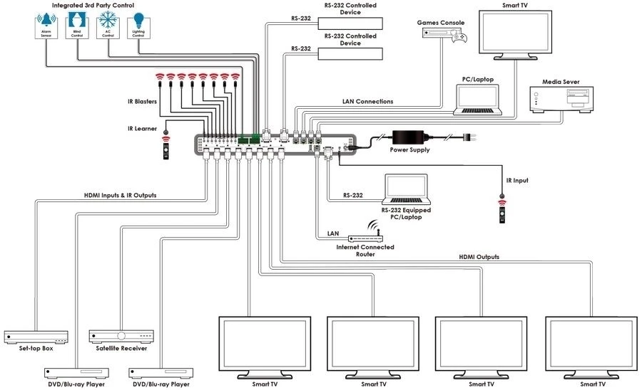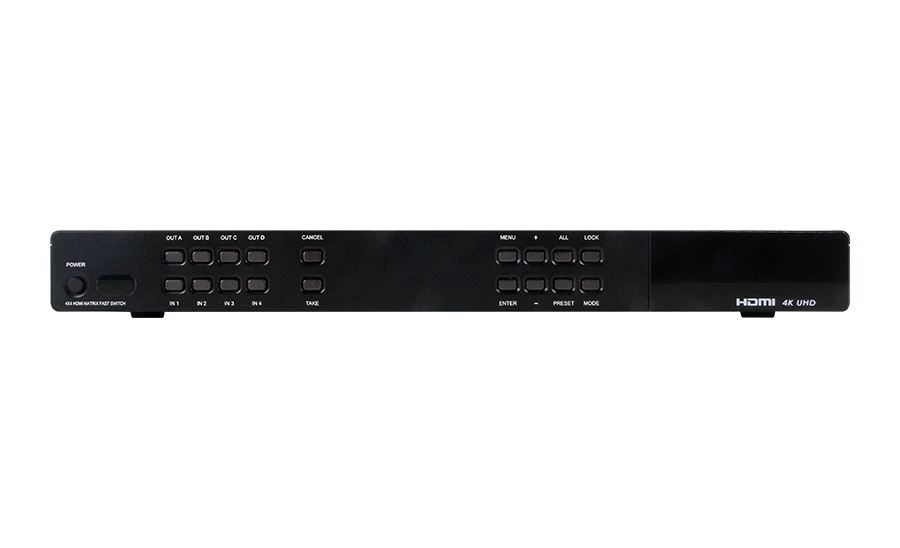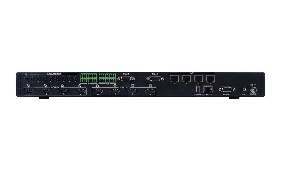 Матричный коммутатор 4х4 HDMI 4K2K (4096x2160p/30, YUV420 – 4096x2160p/60, 3D) с HDCP 1.4 и EDID, контроллер системы управления, обучаемый ИК (miniJack 3,5 мм), триггерные входы (8х терм.), RS-232 (2хD-sub-9), 10/100BaseT (4хRJ45), релейные выходы (8х терм.), выходы ИК (8х miniJack 3,5 мм), монтаж в стойку, управление по IP, ИК и RS-232.