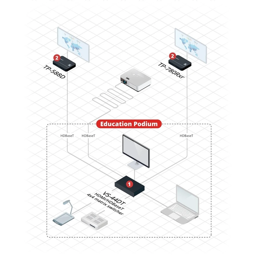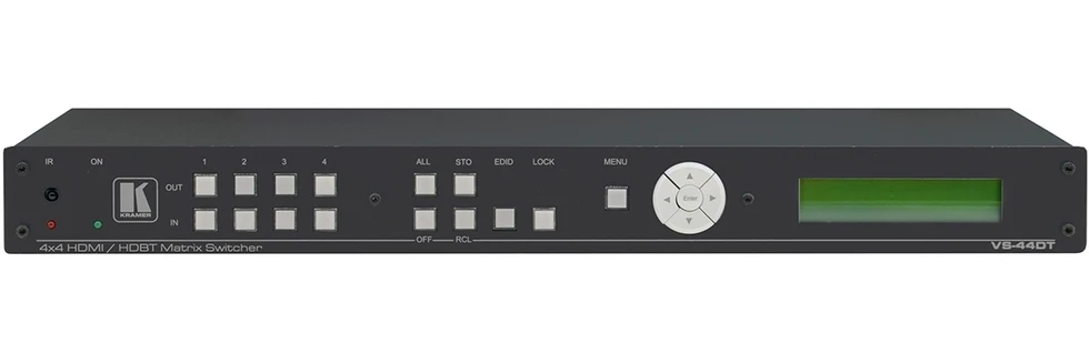 Матричный коммутатор 4х4 HDMI 4K/60 (4:2:0) с расширенным EDID и HDCP, входы 4хHDMI с двунаправленными ИК (10х miniJack 3,5 мм), выходы 2xHDMI, 4xHDBaseT c PoE, стереоаудио (miniJack 3,5 мм), дальность по HDBaseT: 1080p – до 180 м, 4K/30 – до 100 м.