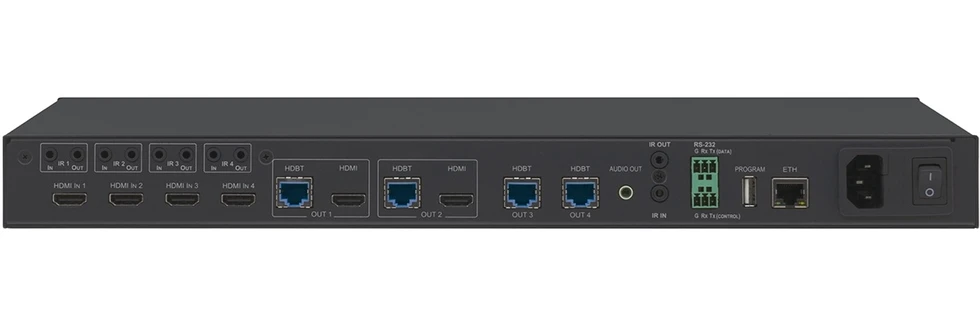Матричный коммутатор 4х4 HDMI 4K/60 (4:2:0) с расширенным EDID и HDCP, входы 4хHDMI с двунаправленными ИК (10х miniJack 3,5 мм), выходы 2xHDMI, 4xHDBaseT c PoE, стереоаудио (miniJack 3,5 мм), дальность по HDBaseT: 1080p – до 180 м, 4K/30 – до 100 м. Управление по ИК, RS-232, IP (web, Protocol 3000).
