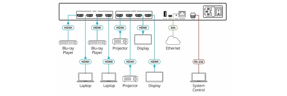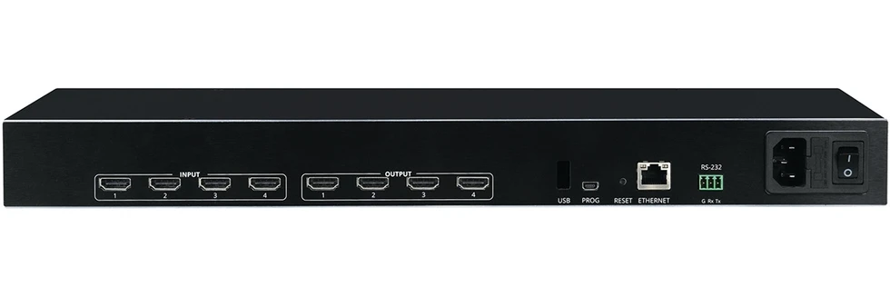 Матричный коммутатор 4х4 HDMI с HDR, ARC, 3D, EDID, HDCP 1.4/2.2, автопереключение, поддержка 4K/60 (4:4:4), 8 пресетов. Управление по ИК, USB, RS-232 и IP (web-интерфейс и Protocol 3000).