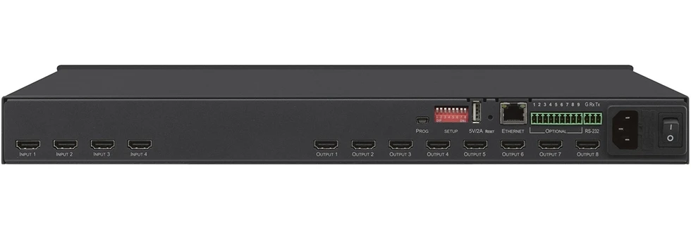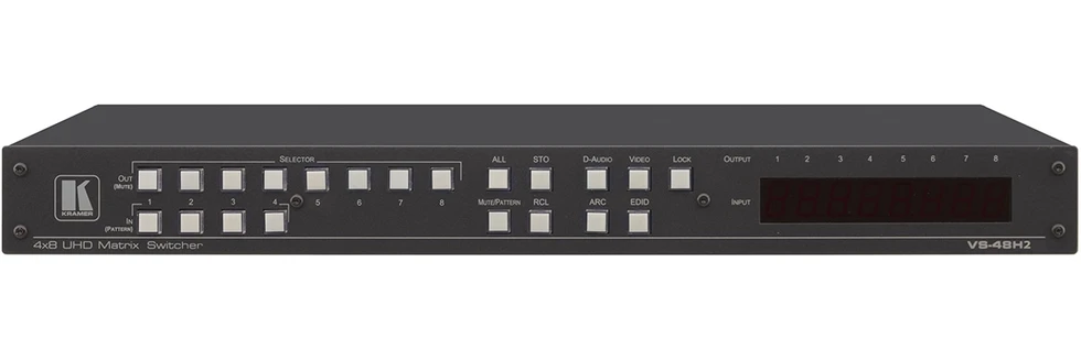 Матричный коммутатор 4х8 HDMI с HDCP 2.2, HDR, EDID, 3D и ARC, Step-In, поддержка 4K/60 (4:4:4), раздельная коммутация аудио и видео. Автоматическая коммутация, управление приоритетом. Управление по IP (web-интерфейс) и RS-232.
