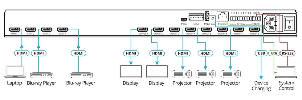 Матричный коммутатор 4х8 HDMI с HDCP 2.