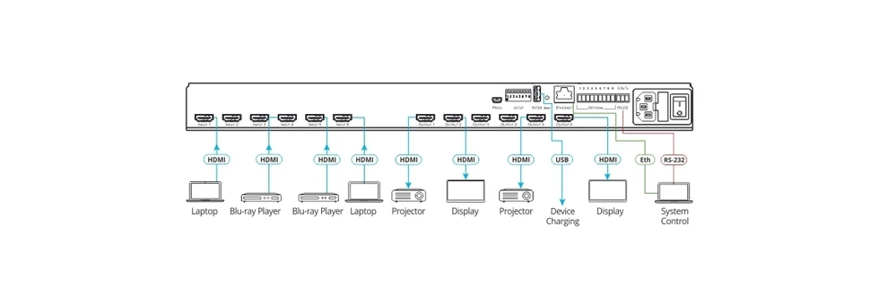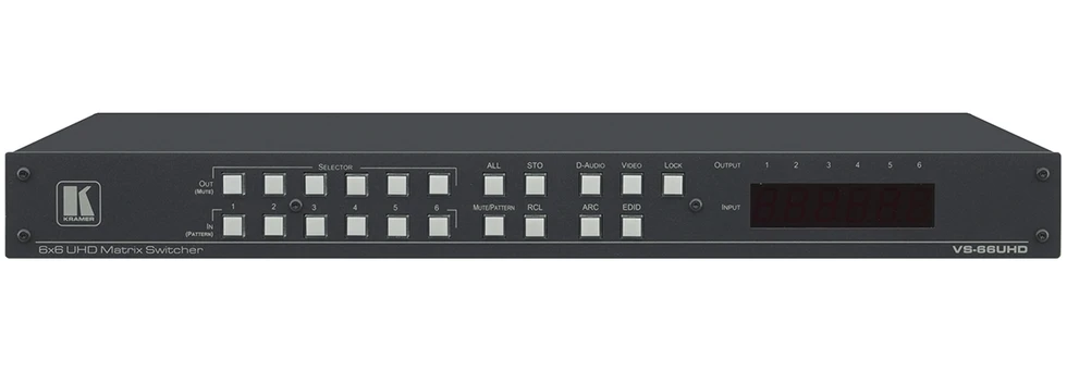 Матричный коммутатор 6х6 HDMI 4K/60 (YUV 4:2:0) с HDCP 1.4, расширенным EDID и ARC, аудиоматрица 12x9, настройка автопереключения источника, поддержка технологии Step-In, 12 пресетов. Управление по RS-232 и IP (web-интерфейс и Protocol 3000).