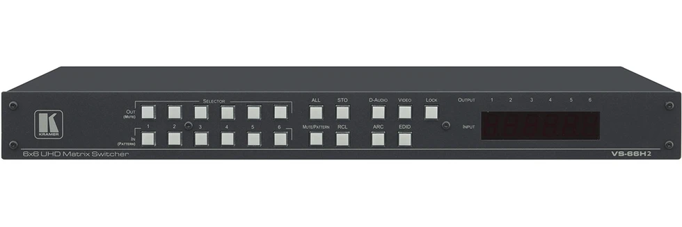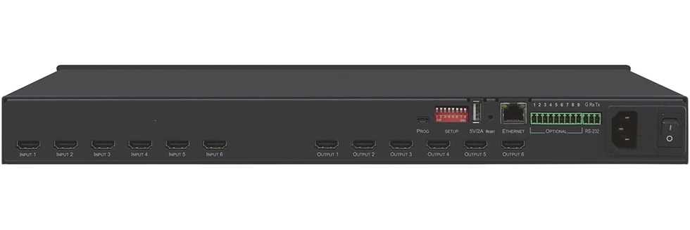 Матричный коммутатор 6х6 HDMI с HDCP 2.2, HDR, EDID, 3D и ARC, Step-In, поддержка 4K/60 (4:4:4), раздельная коммутация аудио и видео. Автоматическая коммутация, управление приоритетом. Управление по IP (web-интерфейс) и RS-232.