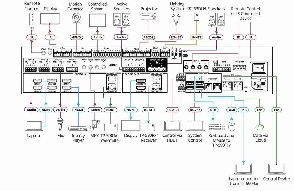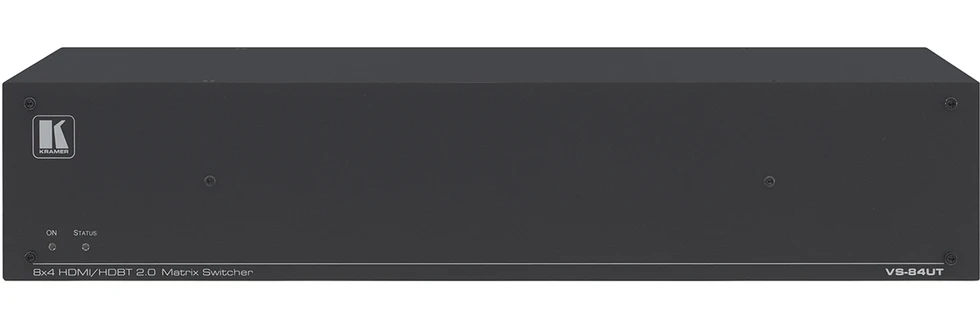 Матричный коммутатор 8х4, входы 6 х HDMI и 2 х HDBaseT с PoE, выходы 2 х HDMI и 2 х HDBaseT c PoE, 4K/60 (4:2:0) с эмбеддированием и деэмбеддированием звука, встроенным главным контроллером помещения (4 х RS-232, RS-485, 4 х ИК, 4 х GPI/O, K-NET, 8 х реле) и усилителем мощности 2 x 30 Вт/ 8 Ом.