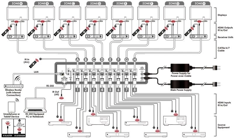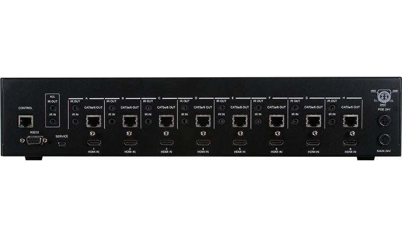 Матричный коммутатор 8х8 HDMI 4K2K (3840x2160p/30, 4096x2160p/30, YUV 4:2:0 – 4096x2160p/60, 3D) с HDCP 2.2 и EDID, входы 8хHDMI, выходы 8хCAT5e c PoC (Power over Cable), HDBaseT, ИК (16х miniJack 3,5 мм), общий ИК (2х miniJack 3,5 мм), расстояние до 100 м, управление по ИК, RS-232 и IP, приемники CH-507RX.