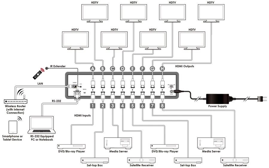 Матричный коммутатор 8х8 HDMI 4K2K (3840x2160p/30, 4096x2160p/30, YUV420 – 4096x2160p/60, 3D) с HDCP 2.
