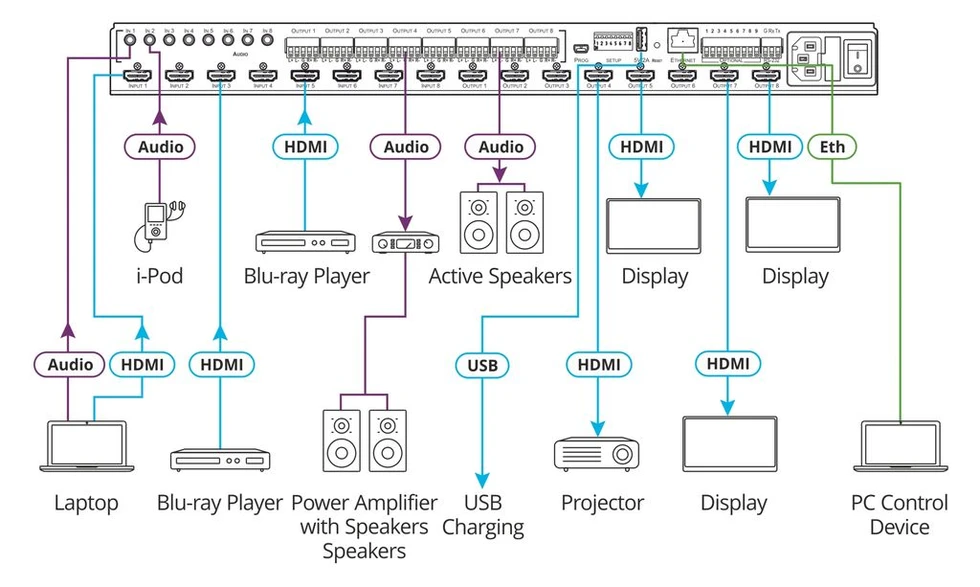 - Независимая коммутация аудио – любой аналоговый или эмбедированный цифровой аудиосигнал может переключаться на любой аналоговый или цифровой выход в дополнение к восьми источникам обратного аудиоканала (ARC), что эквивалентно аудиоматрице размерностью 24x20 (8 входов HDM с эмбедированным аудио + 8 аналоговых аудиовходов + 8 обратных аудиоканалов ARC на входе + 8 выходов HDMI + 4 выхода ARC)