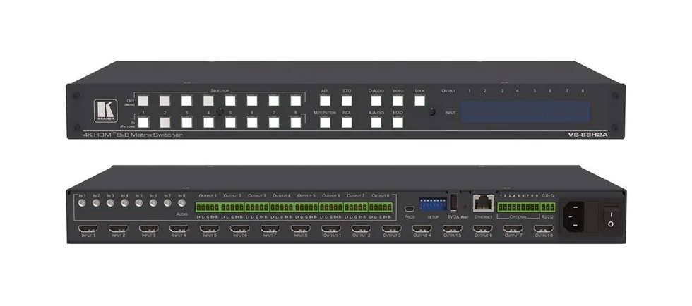 VS-88H2А – матричный коммутатор 8х8 сигналов HDMI c поддержкой разрешений до 4K@60 Гц (4:4:4) и технологии HDR, а также функцией независимого переключения аналоговых и цифровых аудиосигналов. Прибор осуществляет перетактирование входного сигнала, компенсацию АЧХ кабеля и переключение сигнала HDMI от любого из восьми источников сигнала (в т.ч. поддерживающих HDCP-кодирование), на любой из восьми выходов, или любой набор выходов. VS-88H2А обладает непревзойденной гибкостью коммутации аудиосигналов, позволяя переключать любой эмбедированный цифровой или аналоговый аудиосигнал на любой цифровой или аналоговый выход в дополнение к восьми источникам обратного аудиоканала (ARC), что эквивалентно аудиоматрице размерностью 24x20.