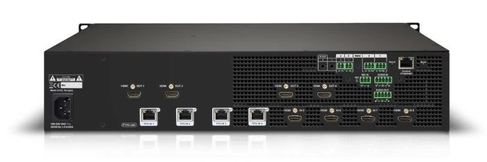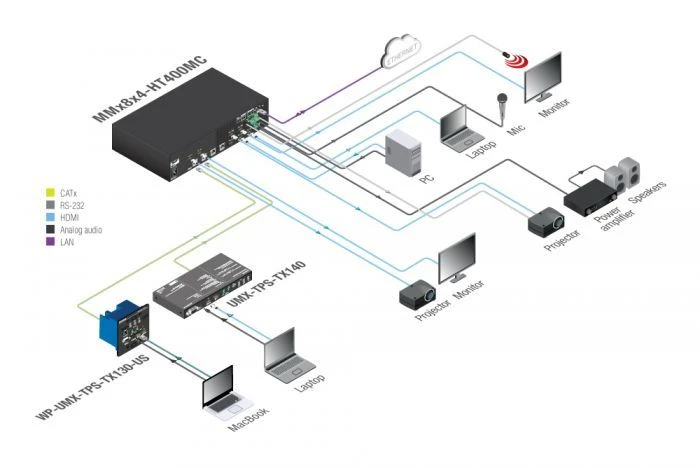 MMX8x4-HT400MC ? это матричный коммутатор, специально разработанный для работы в конференц-залах и переговорных. Он оснащён восемью видеовходами (4 HDMI и 4 TPS) и четырьмя видеовыходами HDMI. Устройство полностью поддерживает 4K / UHD (30Hz RGB 4:4:4, 60Hz YCbCr 4:2:0), 3D и HDCP. MMX8x4-HT400MC оборудован специальным блоком аудиовхода с входными портами активного микрофона (моно) и line-in (стерео). Встроенный саунд-микшер подходит для свободного перемешивания звука микрофона или line-in и интегрированного аудио от одного из входных сигналов HDMI.