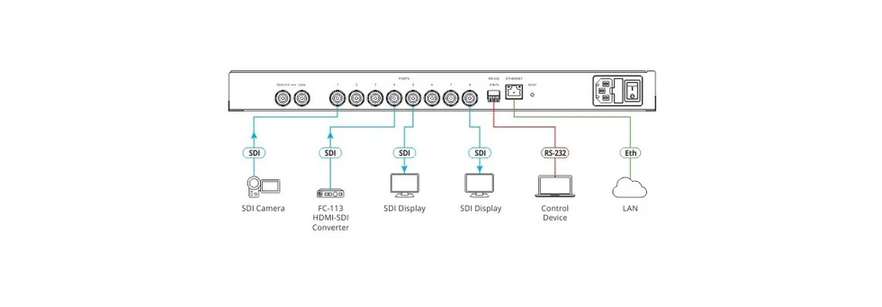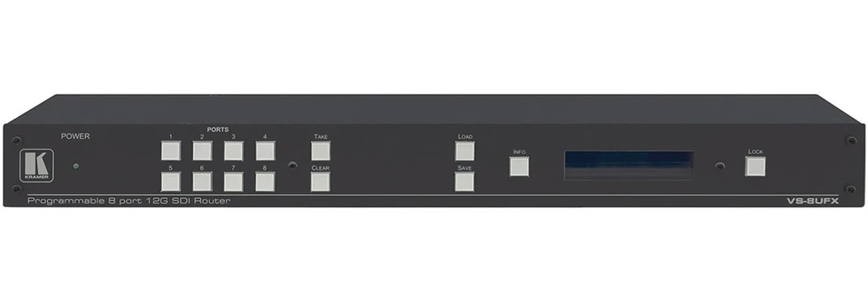 Матричный коммутатор с 8-ю переназначаемыми портами SDI до 12G; вход Genlock с проходным выходом. Управление по RS-232 и IP.