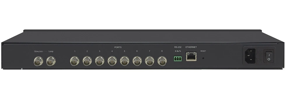 Матричный коммутатор с 8-ю переназначаемыми портами SDI до 12G; вход Genlock с проходным выходом.