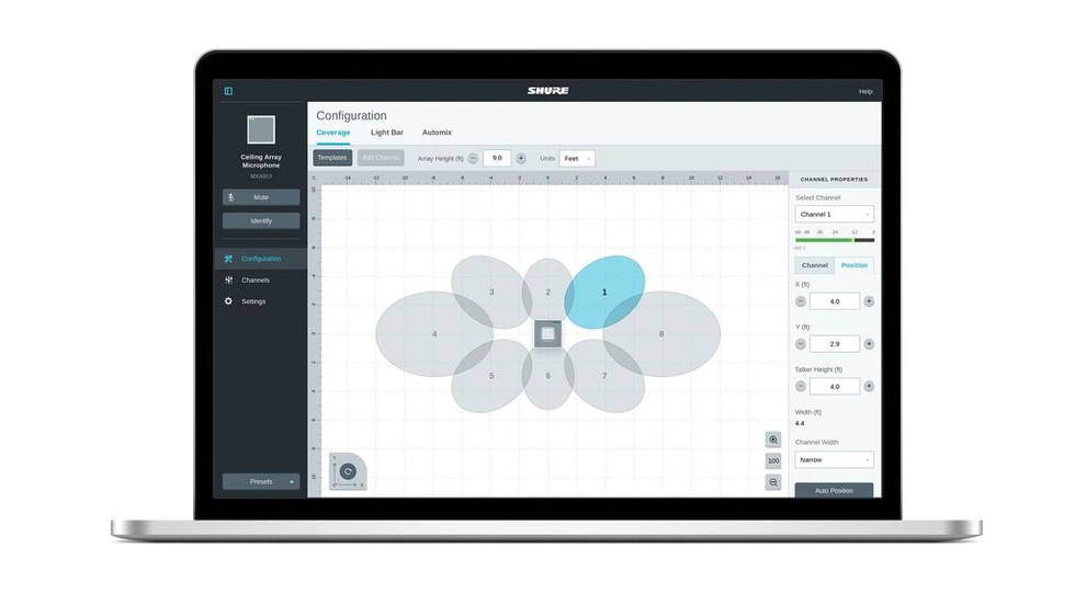 Потолочные Микрофонные Массивы Microflex® Advance™ управляются при помощи программного обеспечения Shure IntelliMix® DSP Suite для точных настроек покрытия, автоматического микширования, коррекции частотности и снижения эхо-эффекта.