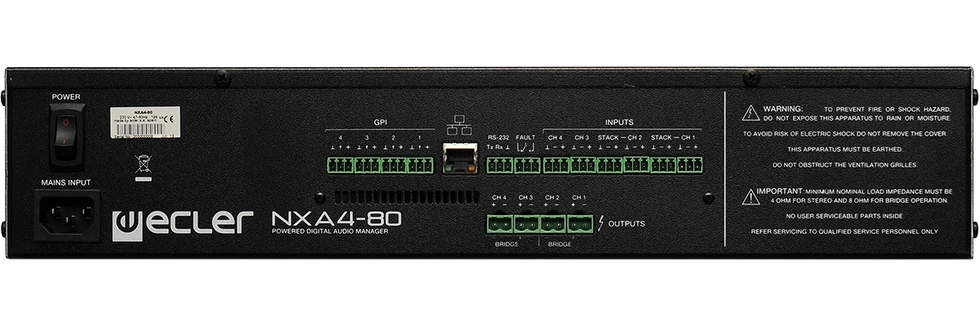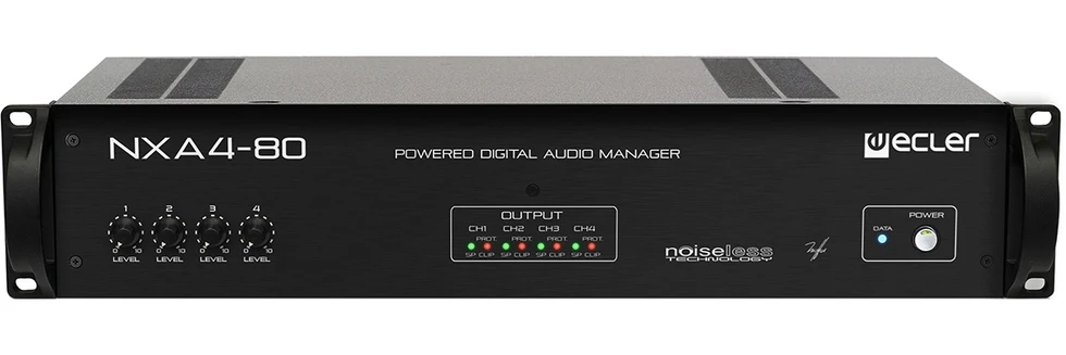 Микшер-усилитель с DSP-процессором по 80 Вт RMS на канал (4 Ом). 4x66 Вт – 4 Ом, 2x160 Вт – 8 Ом. Балансные входы. Управление по RS-232, web-интерфейс, EclerNet Manager, TP-NET (CRESTRON, AMX, RTI и др.).