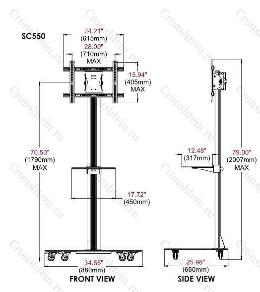 SC550 - мобильная напольная стойка для установки LСD и PDP панелей 32 - 47'' до 68 кг с устойчивым основанием на колесах. Стеклянная регулируемая по высоте полка для дополнительного оборудования. Регулируемая высота установки панели до 1786 мм от пола, VESA 200 х 200, 200 х 400, 300 х 300, 400 х 400, 600 х 400.