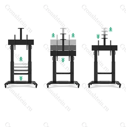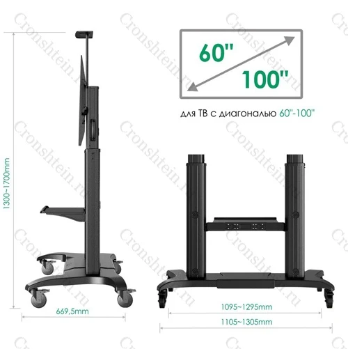 Уникальный телескопический механизм мобильной стойки Onkron TS2811 обеспечивает регулировку высоты стойки в диапазоне от 1300 мм до 1700 мм с шагом в 50 мм. А продуманный механизм регулировки и автоматической фиксации на нужной высоте, благодаря рычажку-фиксатору, делает возможным легкую регулировку высоты уже после полной сборки и закрепления телевизора.