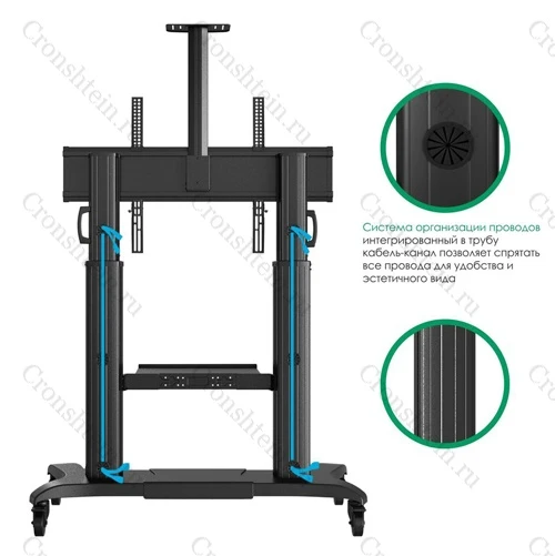 4 маневренных колеса диаметром 100 мм позволяют перевести стойку в любое место в помещении, а встроенные тормоза в каждом из них смогут надежно ее зафиксировать и избежать случайного перемещения.
