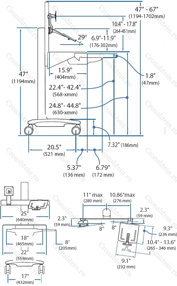 Каждый пользователь, независимо от своих антропометрических особенностей может настроить удобную высоту положения экранов, а не сгибаться и не тянуться к ним, подвергая излишнему напряжению мышцы шейно-плечевого пояса и нанося вред позвоночнику.