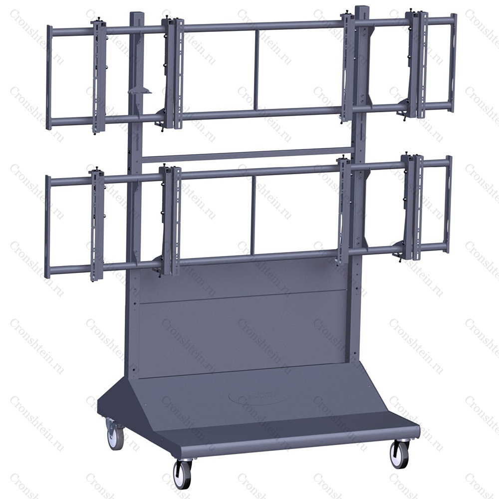 Мобильный стенд для видеостены 2х2 с диагональю экранов 40-65 дюймов. Нагрузка - 227 кг. Стандарт VESA 200x200 - 400x460 мм. Регулировка высоты, центровки, глубины расположения дисплеев. Бокс для скрытого размещения AV-компонентов. Габаритные размеры - 2090х2054х961 мм. Цвет черный.