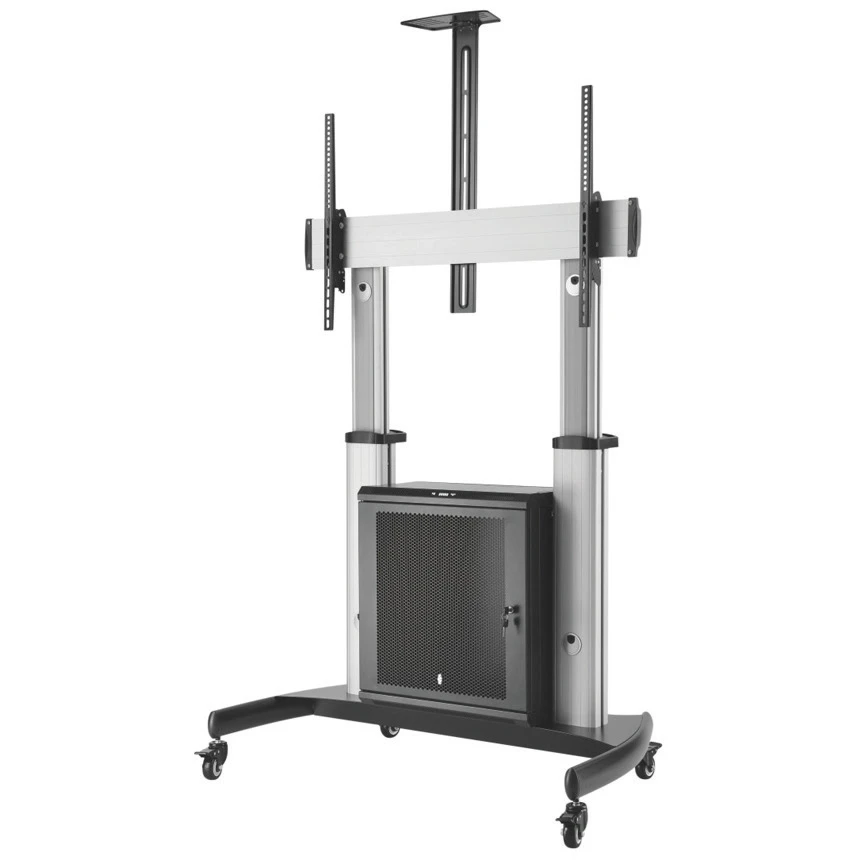Мобильный стенд с регулировкой высоты для дисплея 60–100''. Стандарт VESA 400x400..1000x600 мм. Шкаф для AV-оборудования. Регулировка дисплея по высоте: 1200–1650 мм. Есть крепление для ВКС-камеры до 5 кг. Наклон: ?10..+5°. Макс. нагрузка: 100 кг. Материал: алюминий. Цвет серебристый.