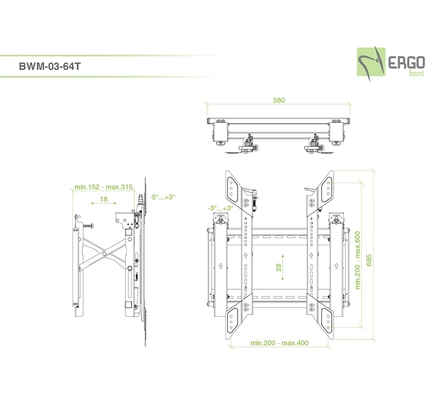 Модульное настенное выдвижное крепление для построения видеостен из дисплеев 45–70''. Портретная ориентация. 6 точек регулировки подъема, поворота и выдвижения. Дисплей фиксируется механизмом блокировки. Стандарт VESA 200x200..400x600. Поворот: ±3° Наклон: 3..-5°. От стены: 152–315 мм. Макс. нагрузка: 70 кг. Цвет черный.