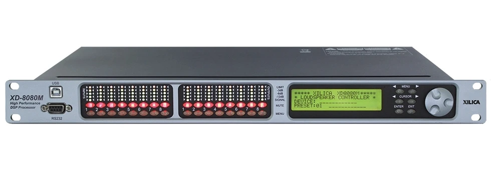 Мощный DSP-аудиопроцессор (40 бит, плавающая точка) серии XD для АС, фиксированная архитектура, IIR и FIR-фильтры, 8 линейных/микрофонных входов, 8 выходов XLR, 2(4)х4 входов/выходов AES/EBU, управление по USB, RS-232 и IP.