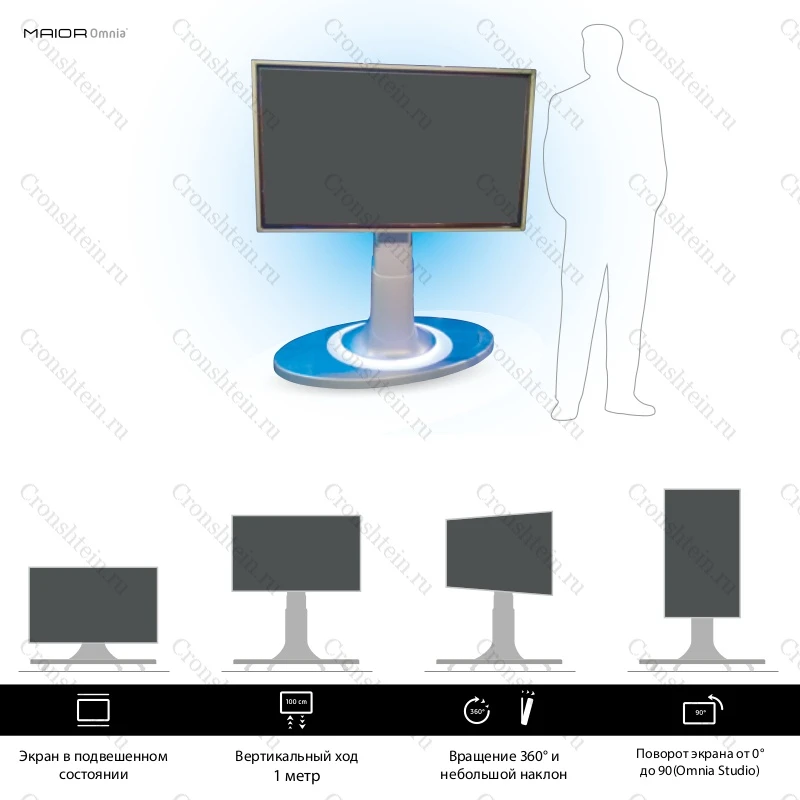 Одной из основных особенностей данной стоик серии Omnia является то, что они полностью моторизированны, благодаря этому можно изменять высоту экрана и поворачивать стойку на 360 градусов.