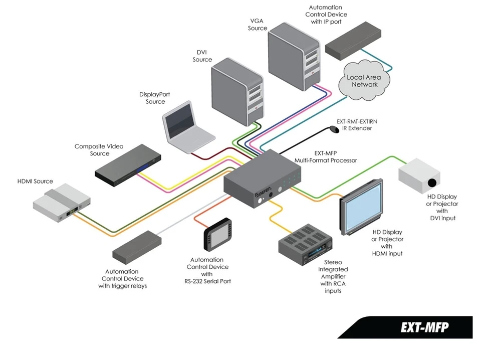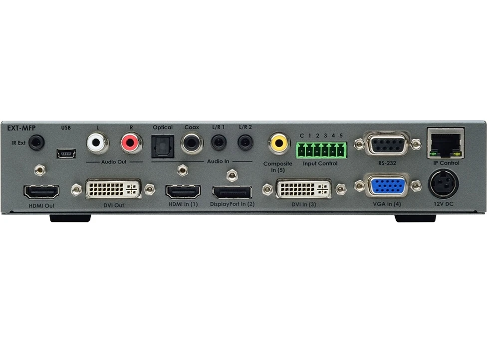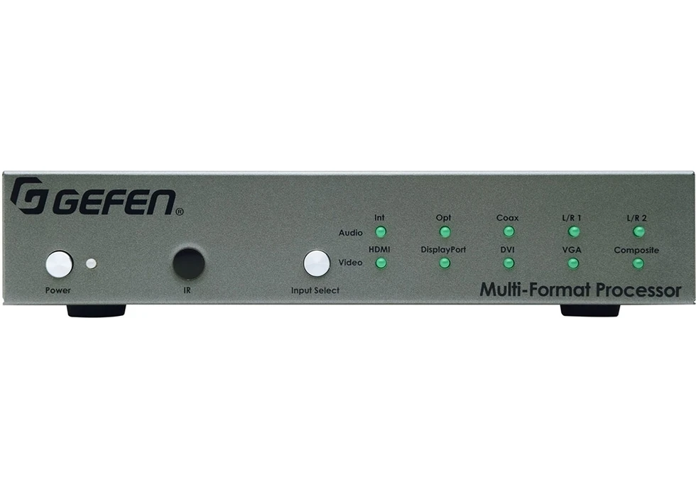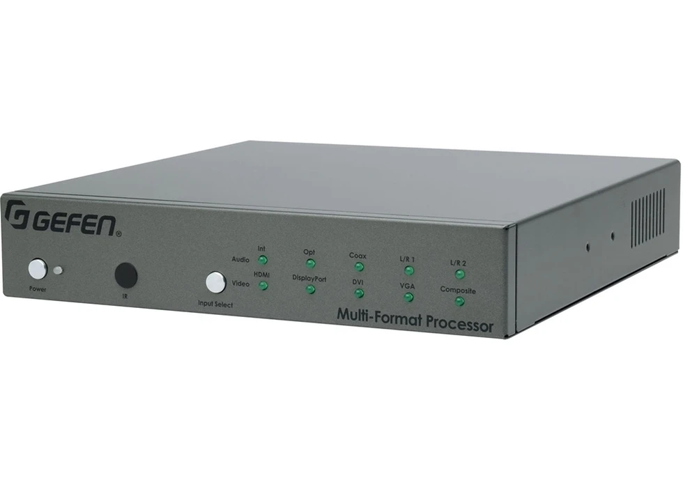 Мультиформатный процессор сигналов CV (RCA), VGA, DVI-D, HDMI, DisplayPort 1080p (1920x1200, 3D), аудио (2х miniJack 3,5 мм) и S/PDIF (RCA, TOSLINK) в сигналы DVI-D и HDMI 1080p (1920x1200, 3D) с HDCP и EDID, аудио (2хRCA), управление по ИК, RS-232, IP (ПО Syner-G).