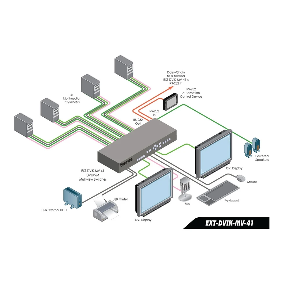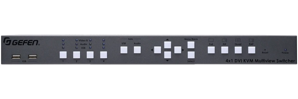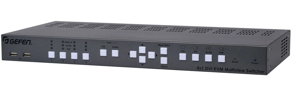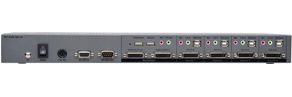 Мультивьювер/ KVM-коммутатор 4x1:2 сигналов DVI-D 1080p (1920x1200) c HDCP, USB (тип B), аудио и микрофоном (2х miniJack 3,5 мм) на два выходных монитора DVI-D 1080p (1920x1200) с 2хUSB, аудио и микрофоном (2х miniJack 3,5 мм), RS-232 для каскадирования, поддержка Syner-G.