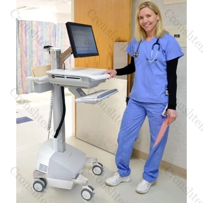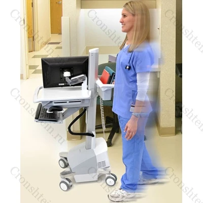 Легкая металлическая стойка Ergotron напольная на колесах для крепления компьютерного оборудования серии "StyleView" для монтажа ноутбука, создает передвижное, настраиваемое под рост оператора рабочее место для работы сидя или стоя, с системой бесперебойного питания емкостью 66 Ампер/ час 230 вольт, 50 герц, рекомендовано для использования в медицинских учреждениях.