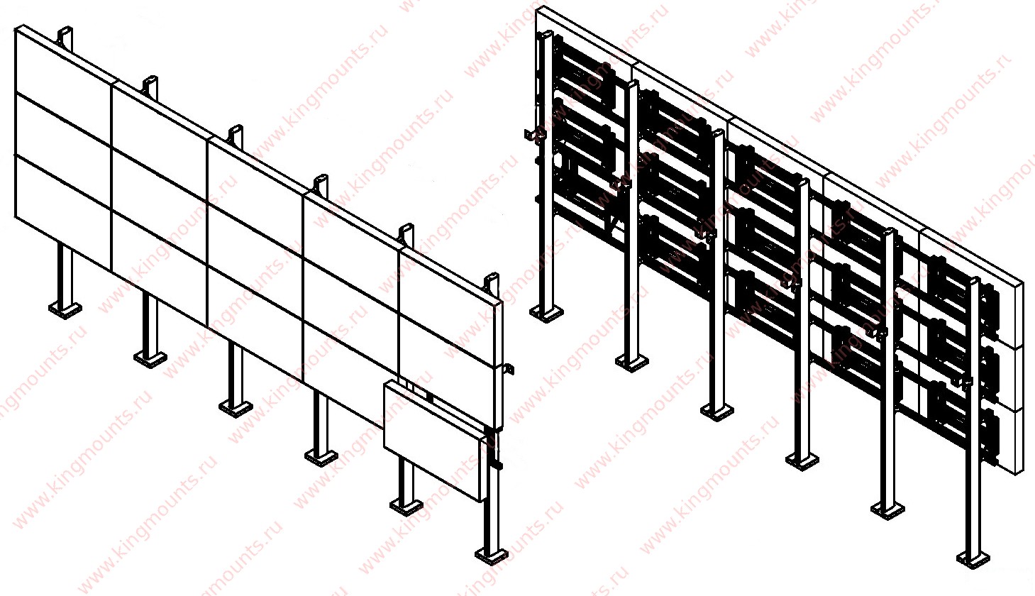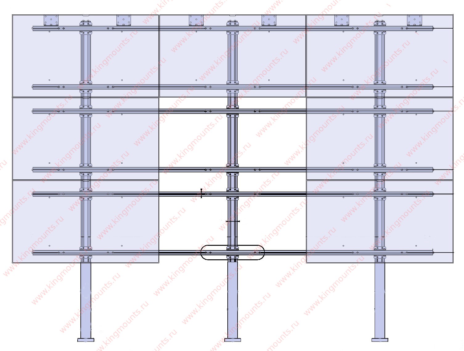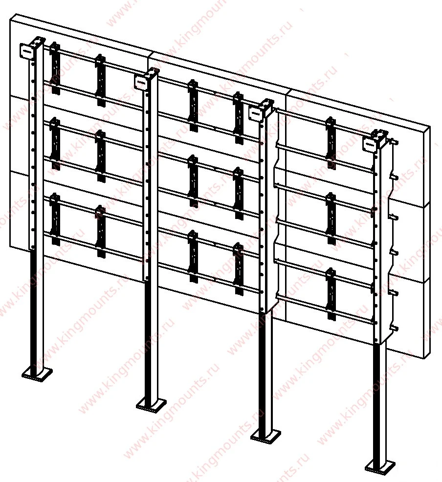 Данное крепление применяется в случаях, когда нет возможности закрепить дисплеи на стене или при создании видеоперегородки в магазинах, переговорных, гостиницах и т.д. Вертикальные столбы каркаса изготовлены из специального профиля, обеспечивающего регулировку по всему диапазону высот. Глубина крепления не менее 800 мм. – вы спокойно сможете разместить за дисплеями оборудование и источники сигнала и питания. После монтажа такого крепления для видеостены, все элементы метало-каркаса,легко декорируются. Юстировка дисплеев (выравнивание) осуществляется в трех плоскостях, в диапазоне 25 мм. с помощью системы микро регулировкиiwall. Шаг микро регулировки: 0,1 мм. Технологический зазор между панелями должен составлять не менее 1 мм. Крепление универсальное и подходит для дисплеев любых производителей. В комплекте крепления прилагается инструкция и чертеж разработанная именно под ваш случай и задачу.