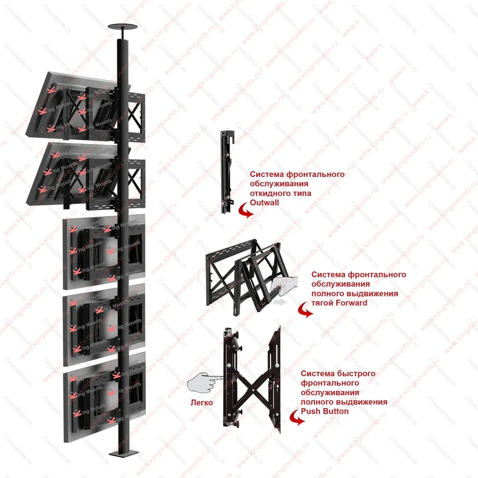 Сервисная система обслуживания дисплеев может быть, как простой- если есть возможность доступа к дисплеям с задней стороны, так и специальной. Российская система креплений видеостен KingMounts® представлена тремя видами фронтального обслуживания дисплеев для удобства коммутации и горячей замены бесшовных панелей. Outwall-бюджетное решение для большинства случаев, представляет собой систему откидного типа. Каждая панель наклоняется на +45 градусов и ставится на специальные упоры. Forward- система полного выдвижения дисплея тягой с функцией AntiLock (4 противокражныхзамка). Панель выдвигается до 300 мм вперед и после этого можно осуществлять юстировку, коммутацию или замену. Применяется в различных случаях, когда нет доступа к тыльной стороне видеостены, пространство ограничено, а время для коммутации и замены должно быть минимальным. Pushbutton- премиальная система полного выдвижения фронтального обслуживания. Достаточно легкого нажатия на дисплей и противокражный замок отщелкнется а пружинный механизм сам выдвинет дисплей на 300 мм. Вперед. Самое быстрое решение по замене, юстировке и коммутации. Применяется в случаях, когда времени на стандартный монтаж нет и в случаях, когда видеостена ставится в нишу или декорируется с минимальными зазорами по краям не более 10мм.