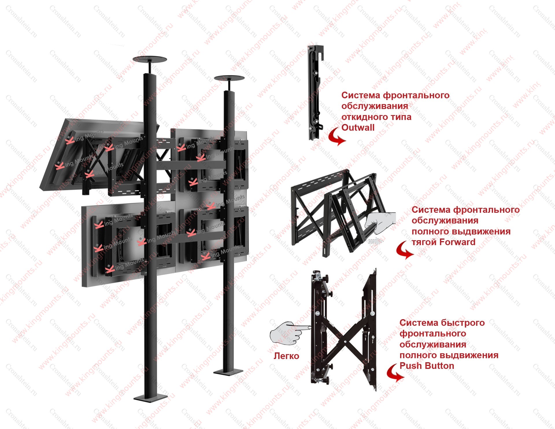 Сервисная система обслуживания дисплеев может быть, как простой- если есть возможность доступа к дисплеям с задней стороны, так и специальной. Российская система креплений видеостен KingMounts представлена тремя видами фронтального обслуживания дисплеев для удобства коммутации и горячей замены бесшовных панелей. Outwall-бюджетное решение для большинства случаев, представляет собой систему откидного типа. Каждая панель наклоняется на +45 градусов и ставится на специальные упоры. Forward- система полного выдвижения дисплея тягой с функцией AntiLock (4 противокражныхзамка). Панель выдвигается до 300 мм вперед и после этого можно осуществлять юстировку, коммутацию или замену. Применяется в различных случаях, когда нет доступа к тыльной стороне видеостены, пространство ограничено, а время для коммутации и замены должно быть минимальным. Pushbutton- премиальная система полного выдвижения фронтального обслуживания. Достаточно легкого нажатия на дисплей и противокражный замок отщелкнется а пружинный механизм сам выдвинет дисплей на 300 мм. Вперед. Самое быстрое решение по замене, юстировке и коммутации. Применяется в случаях, когда времени на стандартный монтаж нет и в случаях, когда видеостена ставится в нишу или декорируется с минимальными зазорами по краям не более 10мм.