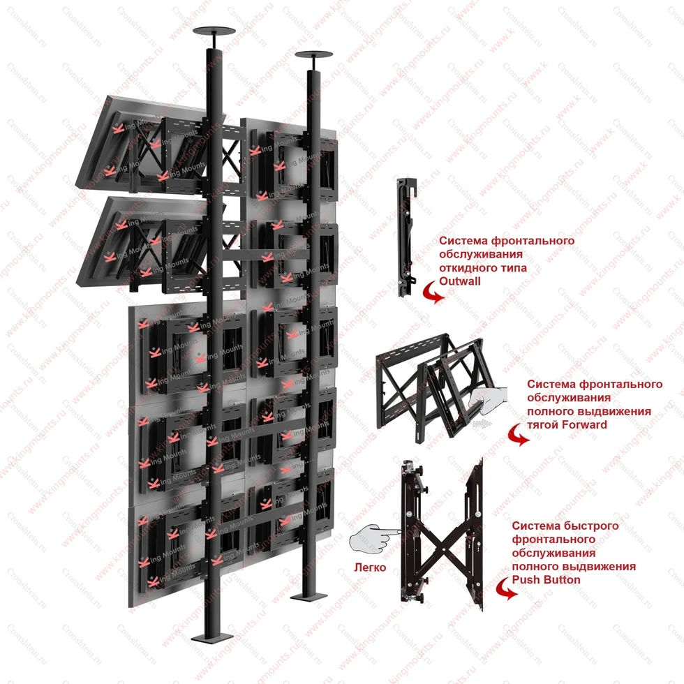 Сервисная система обслуживания дисплеев может быть, как простой- если есть возможность доступа к дисплеям с задней стороны, так и специальной. Российская система креплений видеостен KingMounts представлена тремя видами фронтального обслуживания дисплеев для удобства коммутации и горячей замены бесшовных панелей. Outwall-бюджетное решение для большинства случаев, представляет собой систему откидного типа. Каждая панель наклоняется на +45 градусов и ставится на специальные упоры. Forward- система полного выдвижения дисплея тягой с функцией AntiLock (4 противокражныхзамка). Панель выдвигается до 300 мм вперед и после этого можно осуществлять юстировку, коммутацию или замену. Применяется в различных случаях, когда нет доступа к тыльной стороне видеостены, пространство ограничено, а время для коммутации и замены должно быть минимальным. Pushbutton- премиальная система полного выдвижения фронтального обслуживания. Достаточно легкого нажатия на дисплей и противокражный замок отщелкнется а пружинный механизм сам выдвинет дисплей на 300 мм. Вперед. Самое быстрое решение по замене, юстировке и коммутации. Применяется в случаях, когда времени на стандартный монтаж нет и в случаях, когда видеостена ставится в нишу или декорируется с минимальными зазорами по краям не более 10мм.