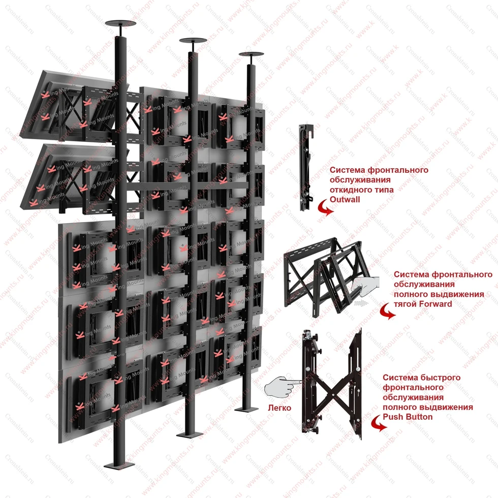 Сервисная система обслуживания дисплеев может быть, как простой- если есть возможность доступа к дисплеям с задней стороны, так и специальной. Российская система креплений видеостен KingMounts представлена тремя видами фронтального обслуживания дисплеев для удобства коммутации и горячей замены бесшовных панелей.